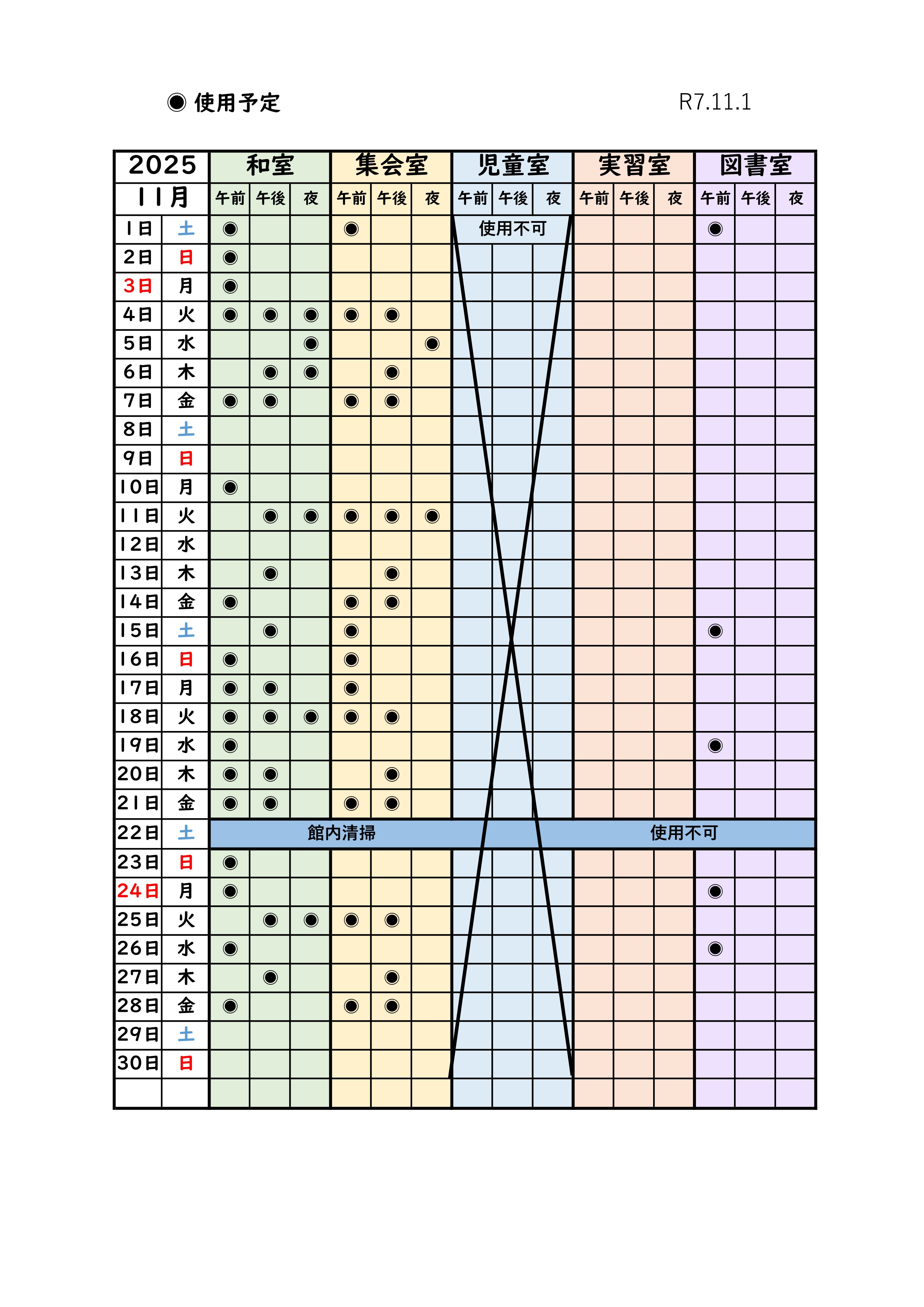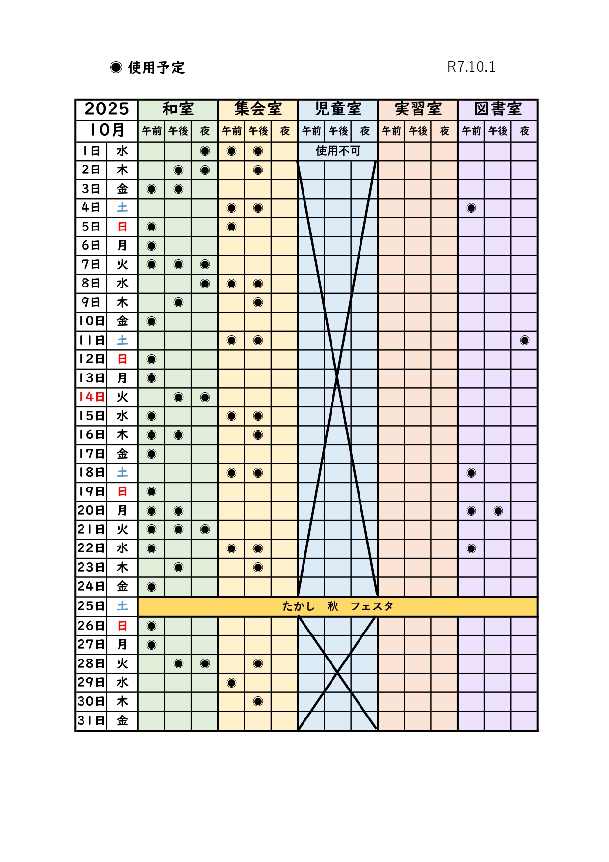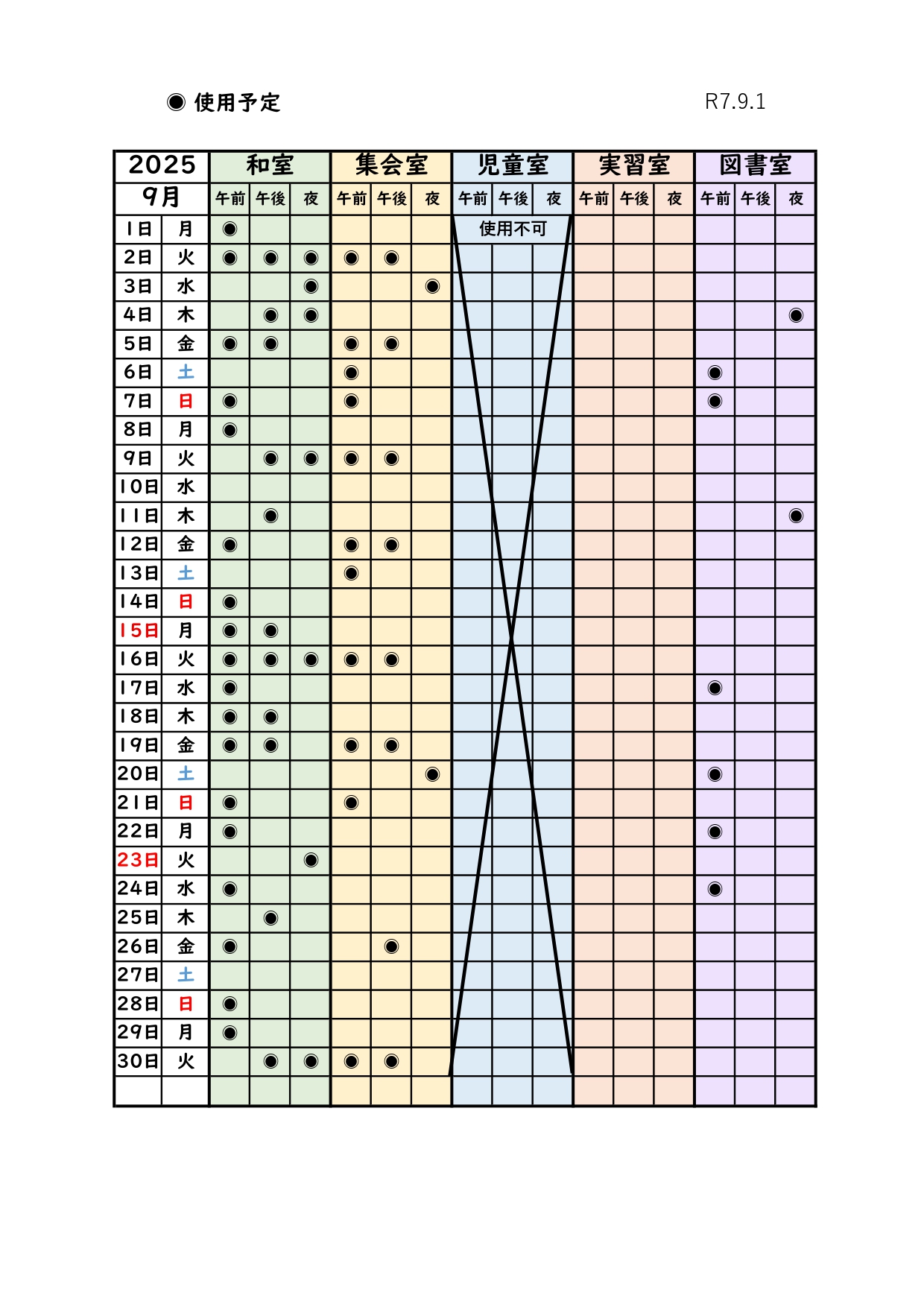 *最新の部屋の状況 最新の部屋の空き状況は電話でお問い合わせください。 (0532)45-9716 高師校区市民館 ( 月曜日~土曜日 12:30~17:30 ) *月別予約状況 *和室・集会室とその他の部屋で利用ルールが一部異なります。 詳しくは、スタッフにお問い合わせください。